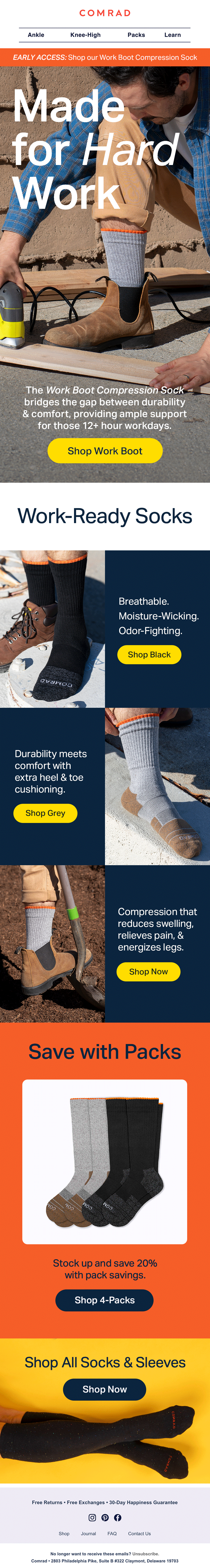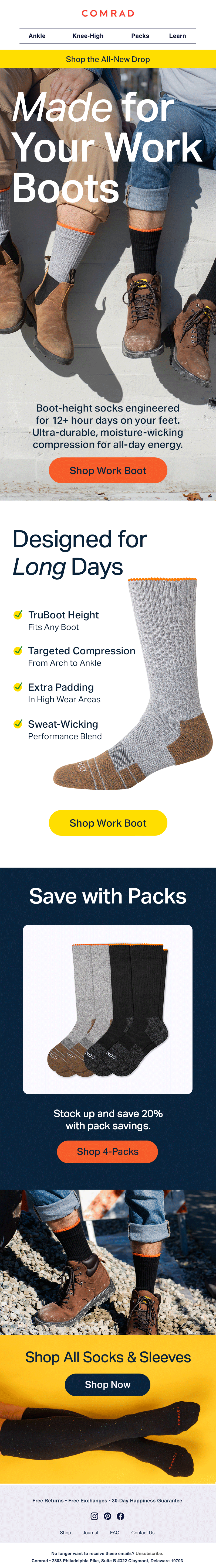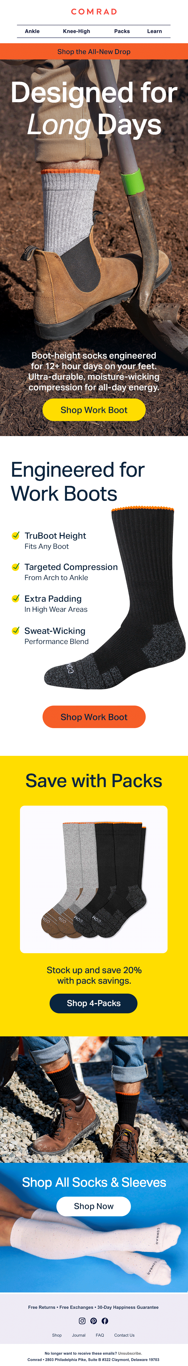 Conceptualization, art-direction and production of multi-channel assets for the launch of Comrad's Work Boot Compression sock.